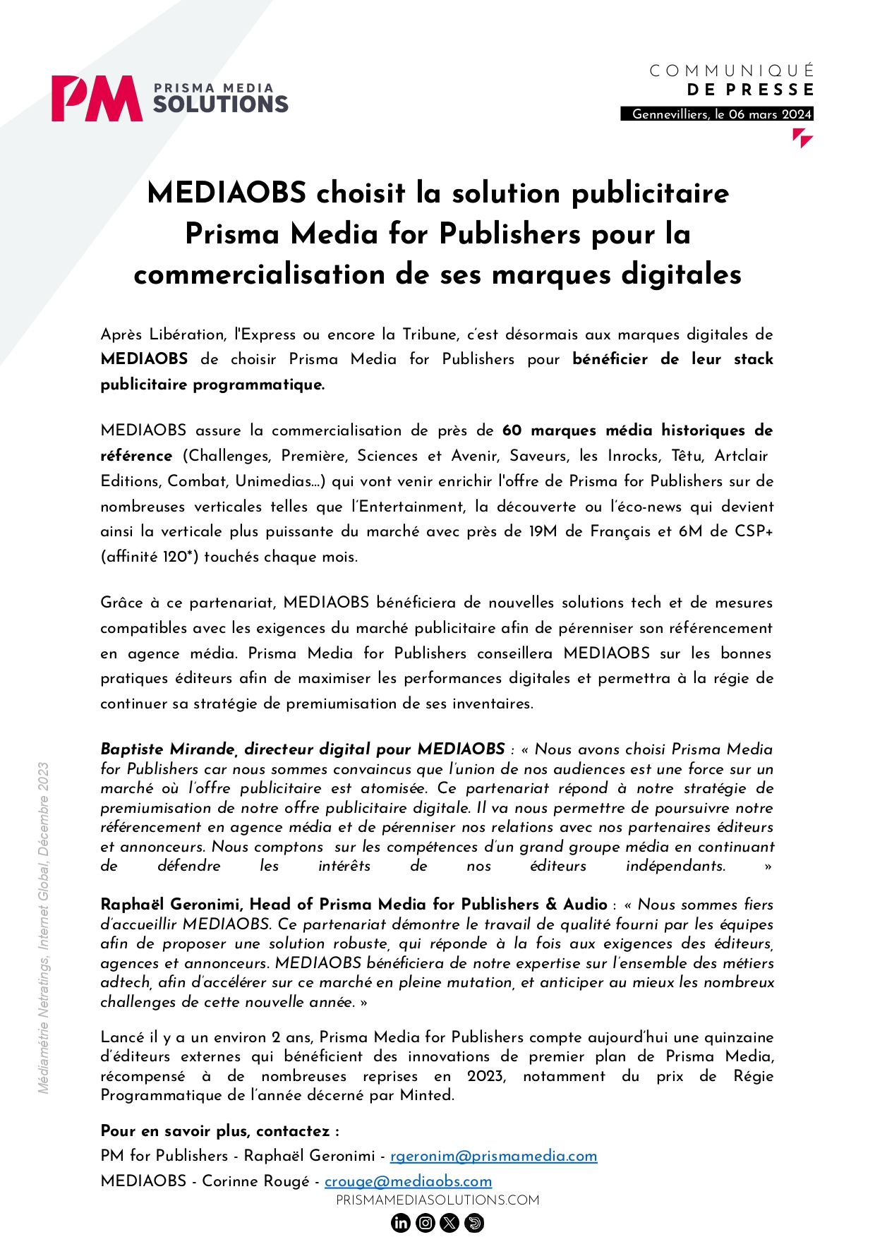 MEDIAOBS assure la commercialisation de près de 60 marques média historiques de référence (Challenges, Première, Sciences et Avenir, Saveurs, les Inrocks, Têtu, Artclair Editions, Combat, Unimedias…) qui vont venir enrichir l’offre de Prisma for Publishers.